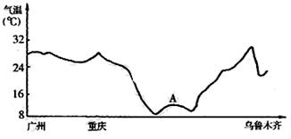 43.读下图“某月广州至乌鲁木齐一线的气温变化图”,回答下列问题:(9分)