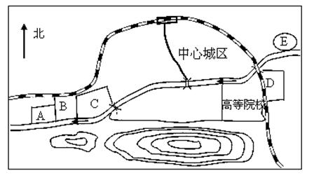 45.某城市将建印染厂、自来水厂、污水处理厂、科技园区和绿化隔离带。下图中的A、B、C、D、E五处可供选址,该地盛行东风。据此并读图,回答问题。(11分)