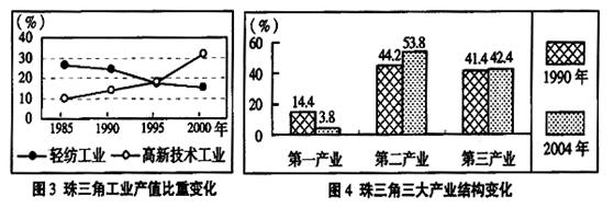 (3).随着经济快速发展,珠三角GDP迅速增长,2004年GDP约是2000年的 倍(1分)。同时,珠三角产业结构也发生了变化,具体表现