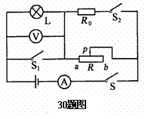 30、图所示电路,电源电压不变,灯泡L标有“6V 3w”字样。当S闭合,S1、S2断开,滑片P从b端滑到 中点时,电流表的示数变化了0.1A,此时电压表的示数为6V;保持滑片P的位置不变,闭合S1、S2, 电流表的示数又变化了2A。则电源电压和定值电阻R0的阻值分别为