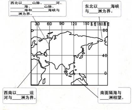 亚洲的地理位置:地处_____、______半球,东北方向以________海峡与_____洲为界,西北以_________山脉、____________河、____海、____________山脉、____海和________海峡与_______洲为界,西南与_________运河与_____洲为界,南面隔海与_______洲相望。