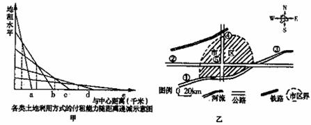 27.图甲中字母代表以城市为中心的土地功能分区,包括有工业区、住宅区、商业区、小麦种植区、花卉与乳牛区,其中表示住宅与及小麦种植区的是                         (   )