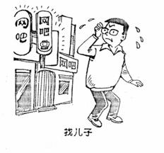 As we can see in the picture, a father is anxiously looking for his son addicted to online games. It seems that he has great trouble finding the boy because the street is full of cyber centers and he hardly knows in which one his son is enjoying games.