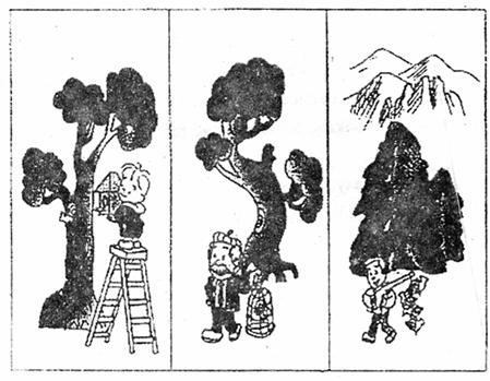 The first is a little boy who managers to put a wooden box in the tree as a house for birds to stay in. The second is an aged man who catches a bird alive and keeps it in a cage which he carries about. While the third, a young man, shoots many birds to cook for dinner.