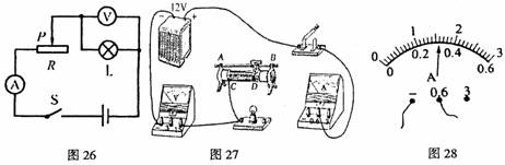 (3)小明正确选择了滑动变阻器,将图27的电路辛卜充连接后,闭合开关,发现灯泡发光较暗,电流表有示数.任意移动滑动变阻器的滑片,电压表示数不变(示数不为零)且小于6V。具体原因是 。