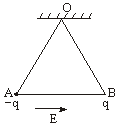 17.有三根长度皆为l=1.00 m的不可伸长的绝缘轻线,其中两根的一端固定在天花板上的O点,另一端分别拴有质量皆为m=1.00×10-2 kg的带电小球A和B,它们的电量分别为-q和+q,q=1.00×10-7C。A、B之间用第三根线连接起来。空间中存在大小为E=1.00×106N/C的匀强电场,场强方向沿水平向右,平衡时A、B球的位置如图所示。现将O、B之间的线烧断,由于有空气阻力,A、B球最后会达到新的平衡位置。求最后两球的机械能与电势能的总和与烧断前相比改变了多少。(不计两带电小球间相互作用的静电力)