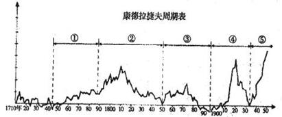 下图为康德拉捷夫世界经济增长与衰退的波动周期表,图中周期②和周期⑤的经济增长波峰分别凸显了“英国世纪”和“美国世纪”的到来,其标志分别是