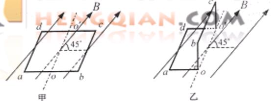 20. 如图甲所示,一个电阻为R面积为S的矩形导线框abcd,水平放置在匀强磁场中,磁场的磁感应强度为B,方向与ad边锤直并与线框平面成角,风别是边的中点。现将线框右半边逆时针旋转到图乙所示位置。在这一过程中,导线中通过的电荷量是