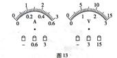(2)实验中,电流表的量程应选 A,电压表的量程应选 V;某次实验中,若电流表的示数是O.3A,电压表的示数是l.5V,请根据你前面选择的量程,在图13中分别画出两表指针的位置
