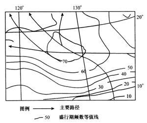 读“某地理现象移动路径和盛行期频数等值线图”,回答28-30题。