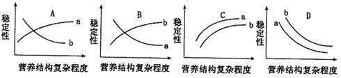 26.生态系统的稳定性与营养结构的复杂程度有着一定的关系,在下图所示曲线中能准确表示两者关系的是(a代表抵抗力稳定性,b代表恢复力稳定性)