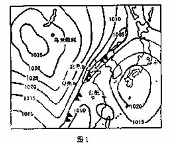 图1为亚洲局部区域某时刻海平面等压线分布图(单位:hPa),据图回答1~2题。