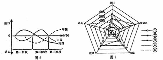 图6反映了产业转移引起某产品在不同国家进出口的变化,图7是五种工业区位选择模式示意图,读图回答14~16题。