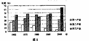 读我国某省1965-2000年三大产业结构变化统计图(图8),回答17-18题。