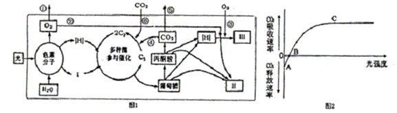 26.(8分)下图1表示某植物叶肉细胞中发生的某些生理过程,其中I.、II、III表示物质,①-⑥表示气体的转移途径,图2表示该植物在不同光照强度下光合作用速率(用CO2吸收速率表示)的变化。请据图回答: