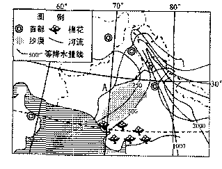 (3)根据图中信息说明该地区有利于棉花种植的自然条件。(4分)