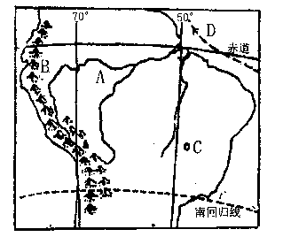 (1)图中A处有世界面积最大的 ,这种资源的破坏对世界气候和生态会产生很大影响。洋流D对沿岸地区的气候具有 作用。图中B山脉西侧自然带的分布有 的特点,这符合自然带分异规律中的 。(4分)