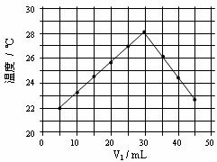 3. 将V1mL1.0mol·L-1 HCl溶液和V2mL未知浓度的NaOH溶液混合均匀后测量并记录溶液温度,实验结果如右图所示(实验中始终保持V1+V2=50mL)。下列叙述正确的是