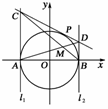 如右图,圆O:x2+y2=16与x轴交于A、B两点,l1、l2是分别过A、B点的⊙O的切线,过此圆上的另一点P(P点是圆上任一不与A、B重合的点)作此圆的切线,分别交l1、l2于C、D点,且AD、BC两直线的交点为M.