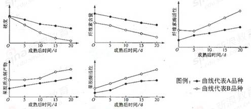 桃果实成熟后,如果软化快,耐贮运性就会差。下图表示常温下A、B两个品种桃果成熟后硬度等变化的实验结果。