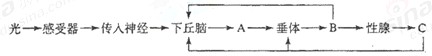 (2)上面图解中的A,B,C 分别代表由下丘脑,垂体和性腺分泌的物质,则他们