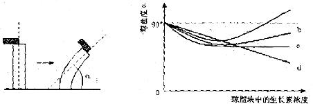 5.某研究小组探究避光条件下生长素浓度对燕麦胚芽鞘生长的影响。胚芽鞘去顶静置一段时间后,将含有不同浓度生长素的琼脂块分别放置在不同的去顶胚芽鞘一侧,一段时间后测量并记录弯曲度(α)。左下图为实验示意图。右下图曲线中能正确表示实验结果的是