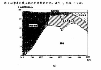 图1 示意某区域土地利用结构的变化。读图1,完成1-2题。