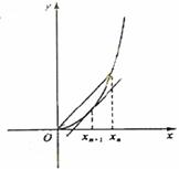 处的切线与经过(0,0)和(xn,f(xn))两点的直线平行(如图)。求证:当n![]()