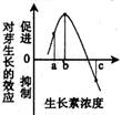 右图表示不同浓度生长素对芽生长的影响。当植物表现出顶端优势(顶芽优先生长,侧芽抑制生长)时,顶芽和最靠近顶芽的侧芽所含生长素的浓度依次分别为