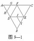 例6.(2003京春文11,理8)如图9-1,在正三角形ABC中,D,E,F分别为各边的中点,G,H,I,J分别为AF,AD,BE,DE的中点.将△ABC沿DE,EF,DF折成三棱锥以后,GH与IJ所成角的度数为( )