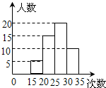 | 为了了解某校八年级学生的体能情况,随机抽查了其中30名学生,测试了1分钟仰卧起坐的次数,并绘制成如图所示的频数分布直方图,请根据图示计算仰卧起坐次数在25~30次的频率是 |