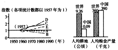| 2、A、B两条折线下降幅度大的是 ,造成下降的原因是 。 A、A;人口增长过慢、没有开发耕地 B、A;人口增长过快、耕地不断减少 C、B;人口增长过快、耕地不断减少 D、B;人口增长过慢、没有开发耕地 |