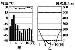 | 读甲、乙两地气温、降水量的月份分配图,回答1~4题。 |