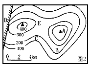 | 小强爸爸准备利用寒假带儿子到南方某地去旅游,小强听了很兴奋。有一定地理知识的爸爸拿出一张等高线图(下图)对小强说:“这是我们要登的山,它比较高,到时我们可要注意……”接着,说明了安全事项,顺便帮小强复习了等高线地形图的有关知识,要求小强上山后留心观察这些地形区。请你据图回答1~2题。 |