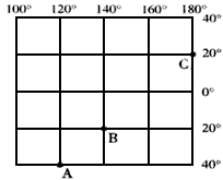 | 读经纬网图判断。下列叙述,正确的是 ①图中A点的经度是120°E,C点的纬度是20°N、②C点位于五带中的热带、③B点位于A点的东南方向、④图中C点位于东半球 |
