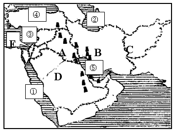 | 1、字母A、B代表哪两个国家? A、伊拉克;伊朗 B、伊朗;沙特阿拉伯 C、伊拉克;沙特阿拉伯 D、阿富汗;伊朗 |