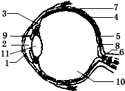 | (1)我们平时所说的“红眼病”,其病变部位是在[ ]_________。 A.1角膜 B.3虹膜 C.9巩膜 D.5视网膜 (2)视觉形成的大致过程是:外界物体反射来的光线,依次经过[ ]_________、[2]瞳孔、[11]_晶状体和[10]玻璃体,并经过[ ]_________折射,最终落在[ ]_________,形成物像。 A.3角膜 11玻璃体 5视网膜 B.1角膜 11晶状体 5视网膜 C.9角膜 11晶状体 5脉络膜 D.1角膜 11玻璃体 5脉络膜 (3)近视是由于[ ]_________的曲度变________,且不能恢复,或是由于眼球后径_______引起的。近视眼可通过配戴_________加以矫正。 A.10玻璃体 小 过长 凹透镜 B.11晶状体 大 过长 凹透镜 C.10玻璃体 小 过短 凸透镜 D.11晶状体 大 过短 凸透镜 |