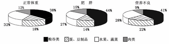 | 每年的5月20日是“中国学生营养日”。有关数据表明,我国学生营养不良和营养过剩的状况令人担忧。无机盐、维生素等摄入量不足,缺铁性贫血现象普遍存在;多糖分、高脂肪的饮食习惯使肥胖儿逐年增多,早餐“马虎”、中餐“凑合”、晚餐“丰富”等错误的营养消费观念,是导致学生营养状况问题的主要原因。下图显示,不同人群中每天摄入的食物比例是不同的。请回答下列问题: |