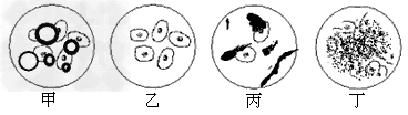| 在用低倍镜观察人的口腔上皮细胞实验时,甲、乙、丙、丁四位同学分别在视野中看到的物像如图所示。你认为________同学的观察效果最好。 |