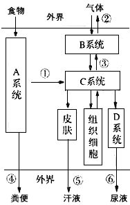 | 下图是人体消化、呼吸、循环及排泄等生理活动示意图,其中的A、B、C、D表示人体的几大系统。①、②、③、④、⑤表示人体的某些生理过程。请据图回答下列问题。 |