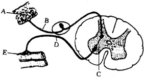 | 下图是人体反射弧的示意图,请据图回答,如果A代表的是手部皮肤内的感受器,则神经冲动的传导方向是 |