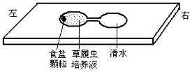 | 某同学在探究草履虫对外界刺激的反应时,在右侧液滴的边缘放了少许物质,发现左侧液滴中的草履虫都向右侧液滴运动,你能判断该物质对草履虫的刺激是有利的还是有害的吗? A.有利 B.有害 C.无法判断 |
