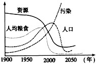 | 科学家曾经提出一个“人口增长,自然资源与环境污染的世界模型”,如下图所示。请你分析回答图中四条曲线之间的相对关系: |