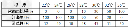 | 爬行动物是卵生动物,很多的爬行动物受精卵发育成雄性个体还是雌性个体,与孵化时的温度有关,分析下表中雄性个体出现的百分率,其中性别发育不受温度影响的是 |