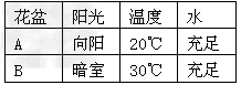 A.两个花盆应该都放在向阳的地方 B.两个花盆应该都放在暗室里 C.两个花盆应该放在同一温度的环境中 D.两个花盆浇的水不应该同样充足 |