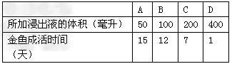| 为了探究废电池对水体的污染,某同学设计了如下实验: ①将一节5号电池破碎,浸泡在1000毫升的清水中2-3 天; ②在四只鱼缸上分别贴上标签A、B、C、D; ③在四只鱼缸中分别加入等量的清洁无污染的河水; ④在四只鱼缸中分别加入50毫升、100毫升、200毫升、400毫升电池浸出液; ⑤再向各鱼缸中分别放入三条金鱼,定时喂养同种饲料,观察并记录情况如下表所示。 根据以上设计回答下列问题: |