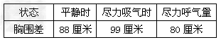 | 张同学测量了李同学在不同呼吸状态下的胸围:平静吸气时91厘米、平静呼气时88厘米、尽力吸气时95厘米、尽力呼气时86厘米。李同学的胸围差是: |