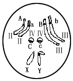 A.该个体能产生8种基因型的精子(只考虑图中基因) B.如果此细胞已经产生了一个AbC的精子,则其他三个精子的基因型分别是aBc、aBc、AbC C.在此个体的精巢中,若一些初级精母细胞共有10个B基因,则这些初级精母细胞可形成5个含b的精子 D.这三对等位基因控制的性状的遗传与性别不相关联 |