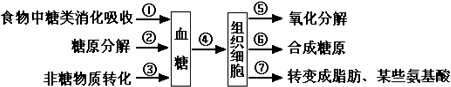 A.胰岛素促进④、⑤、⑥等过程 B.胰岛B细胞分泌的激素促进①、③过程 C.胰岛A细胞分泌的激素促进④过程 D.在肌肉、肝脏细胞中,②过程均可发生 |