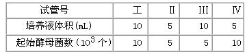 | 在“探究培养液中酵母菌种群数量的动态变化”实验中,同等实验条件下分别在4支大试管中进行培养(见下表),均获得了“S”型增长曲线。根据表中实验设置,判断下列说法错误的是 |